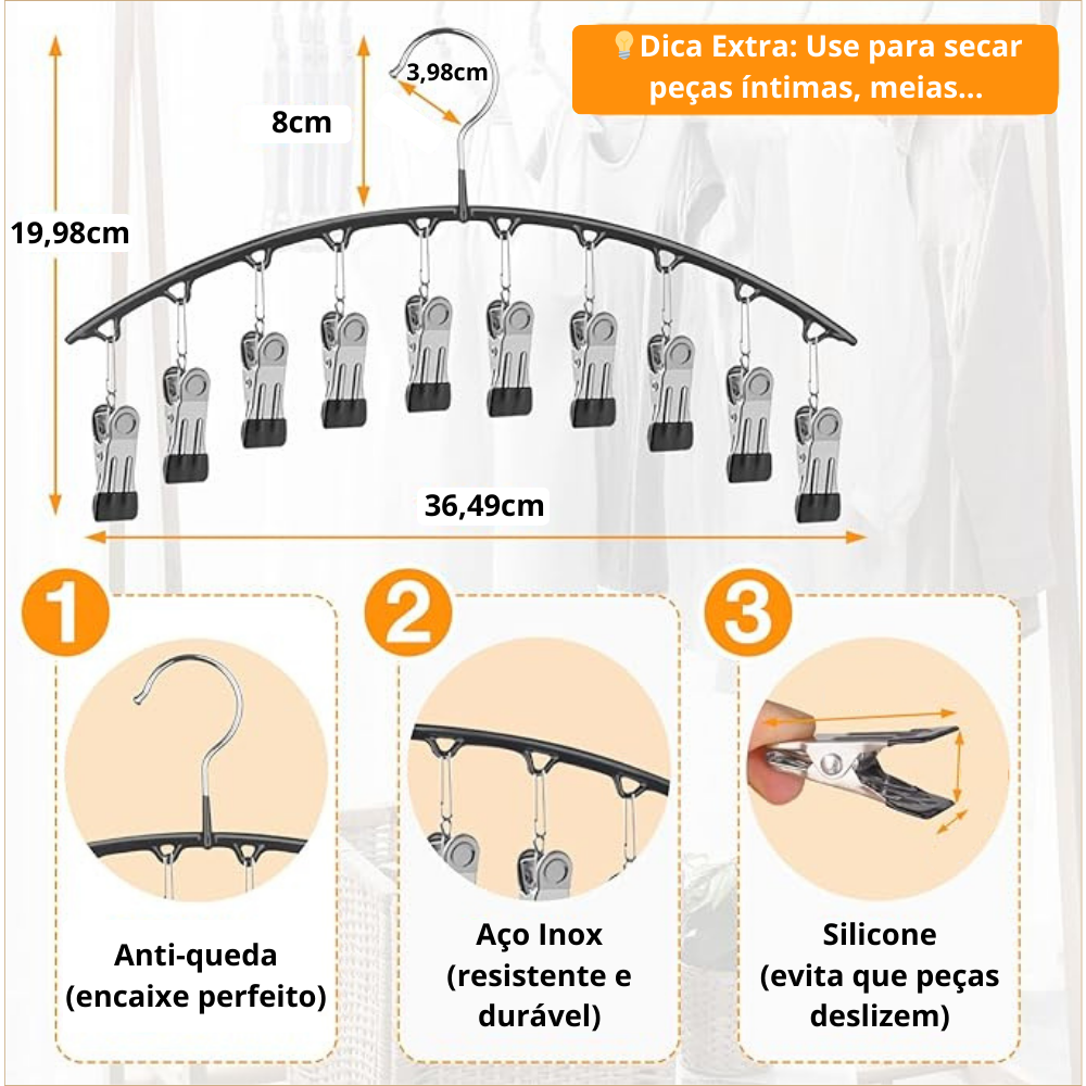 Cabide com 10 Prendedores Aço Inox FitClips - Black Friday de Páscoa 50% OFF + Frete Grátis